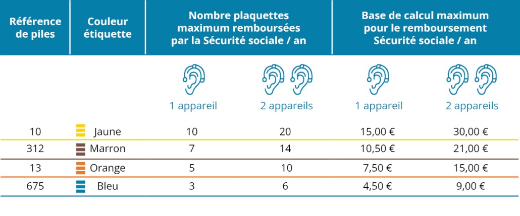 Depuis 2019, la Sécurité sociale a fixé une base de remboursement pour les piles auditives à 1,50 € par plaquette de 6 piles. Cependant, cette prise en charge varie en fonction de la référence des piles, de leur couleur d’étiquette, et du nombre d’appareils auditifs utilisés (1 ou 2).